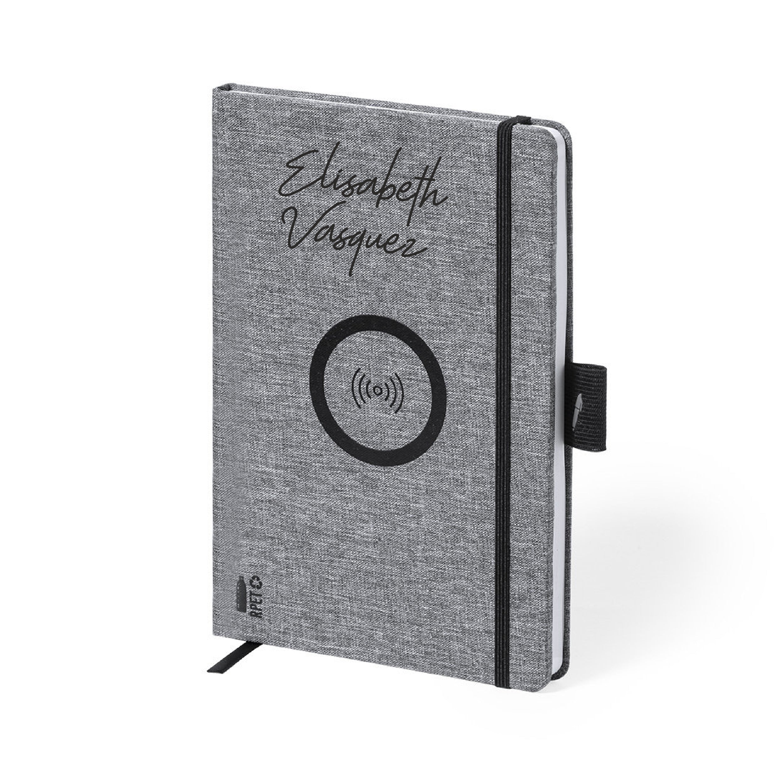 Bloco de notas carregador da linha nature em resistente poliéster 300D RPET de tamanho A5 e elaborado a partir de plástico reciclado, para assim fomentar a reutilização de resíduos plásticos e ajudar a sustentabilidade do planeta.
