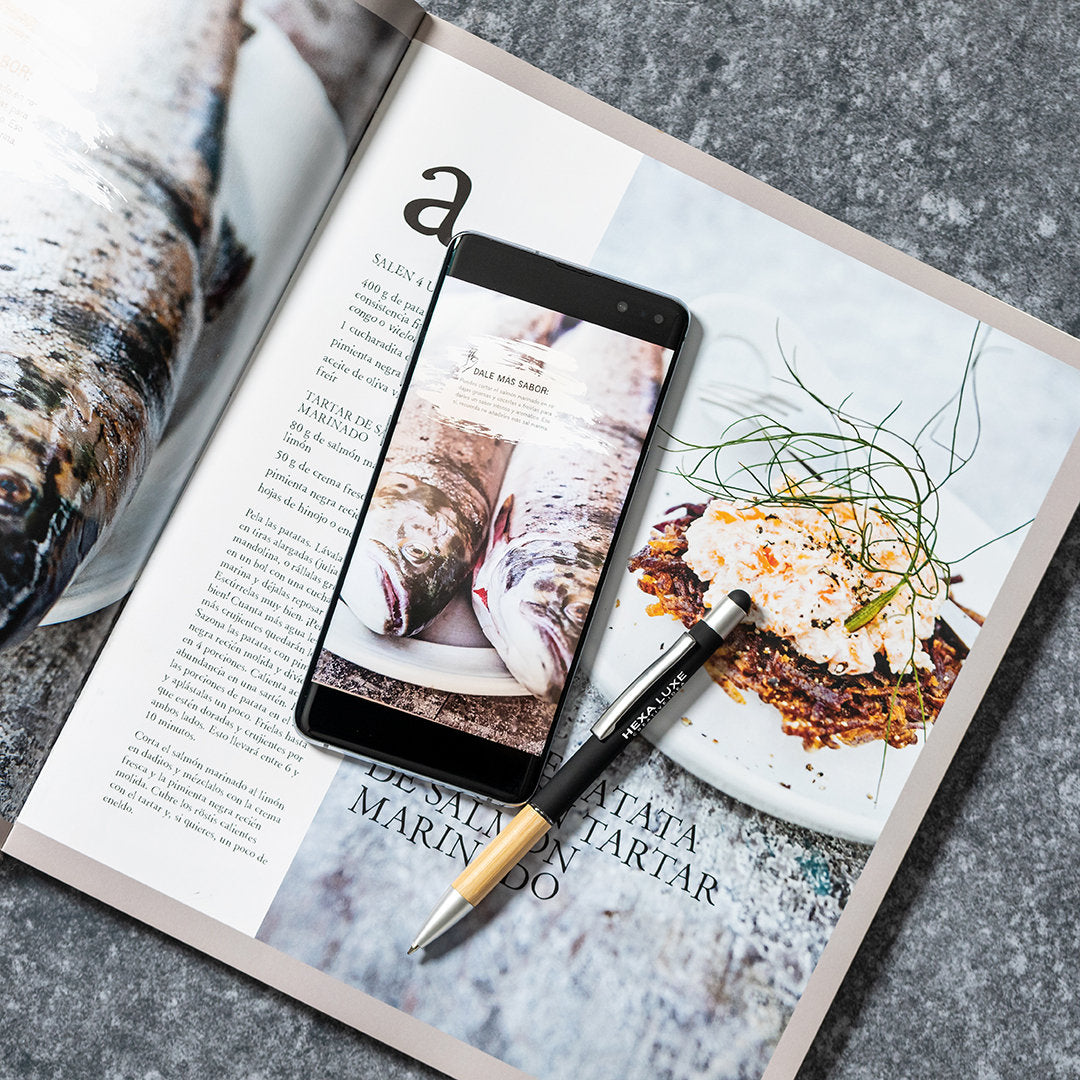 De elegante design, com corpo em alumínio de acabamento mate e pega em bambú, com acessórios em acabamento mate.