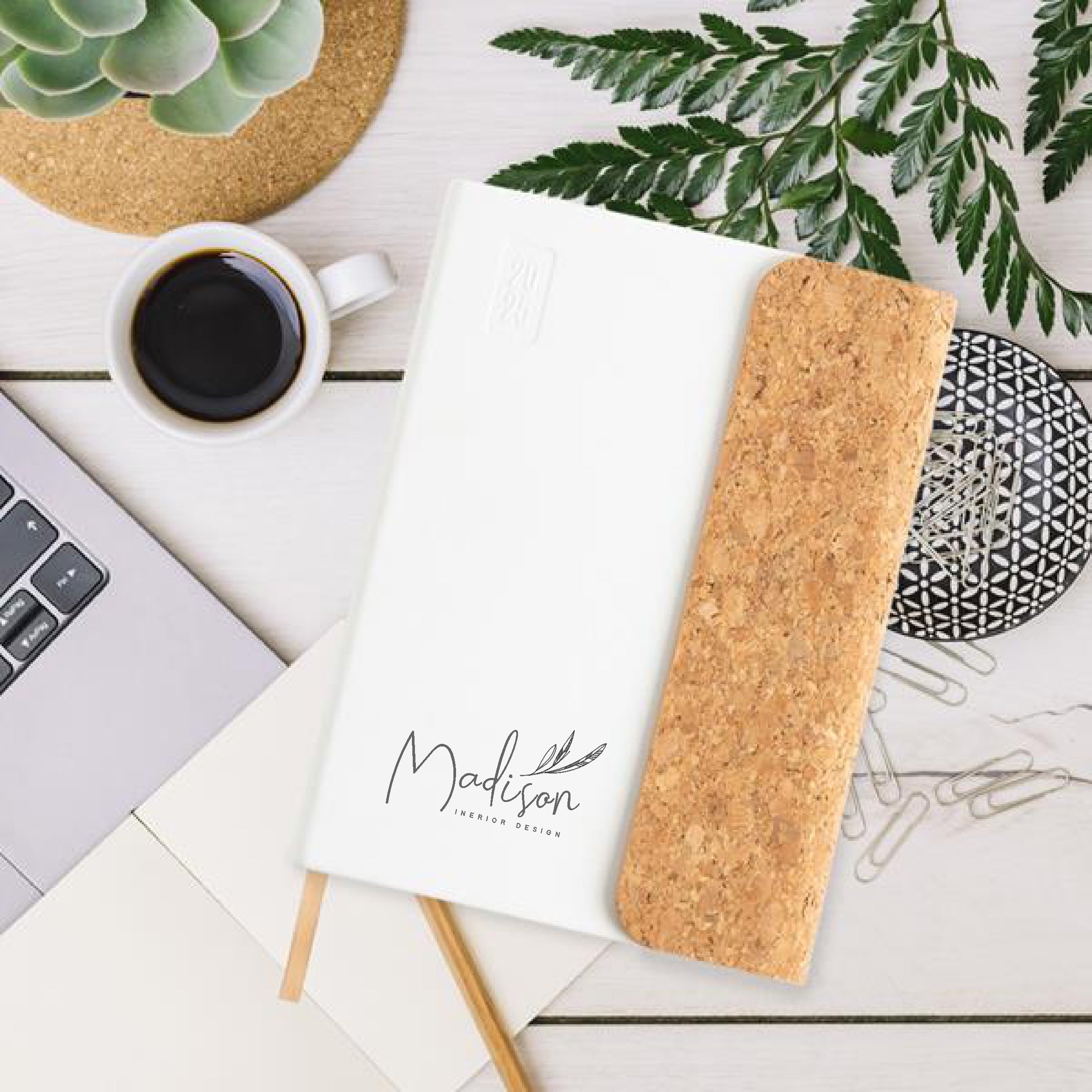 Capa em PU com aba em cortiça, magnético para fechar, com fitilho e suporte para esferográfica dentro da aba.
