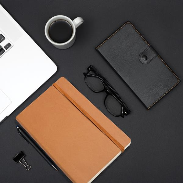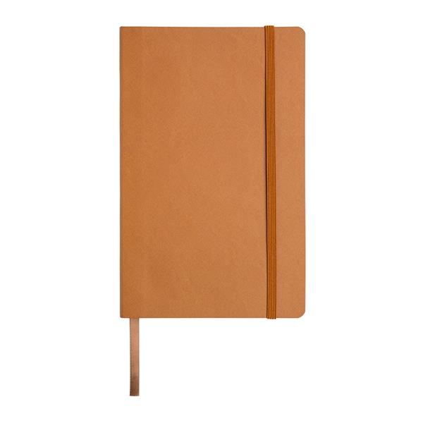 Um brinde que prima pela diferença, especialmente pela sua capa mole em PU térrmico. De tamanho A5, conta com 160 páginas, em papel de 70g, proveniente de florestas geridas de forma responsável. Incluí fitilho e elástico.