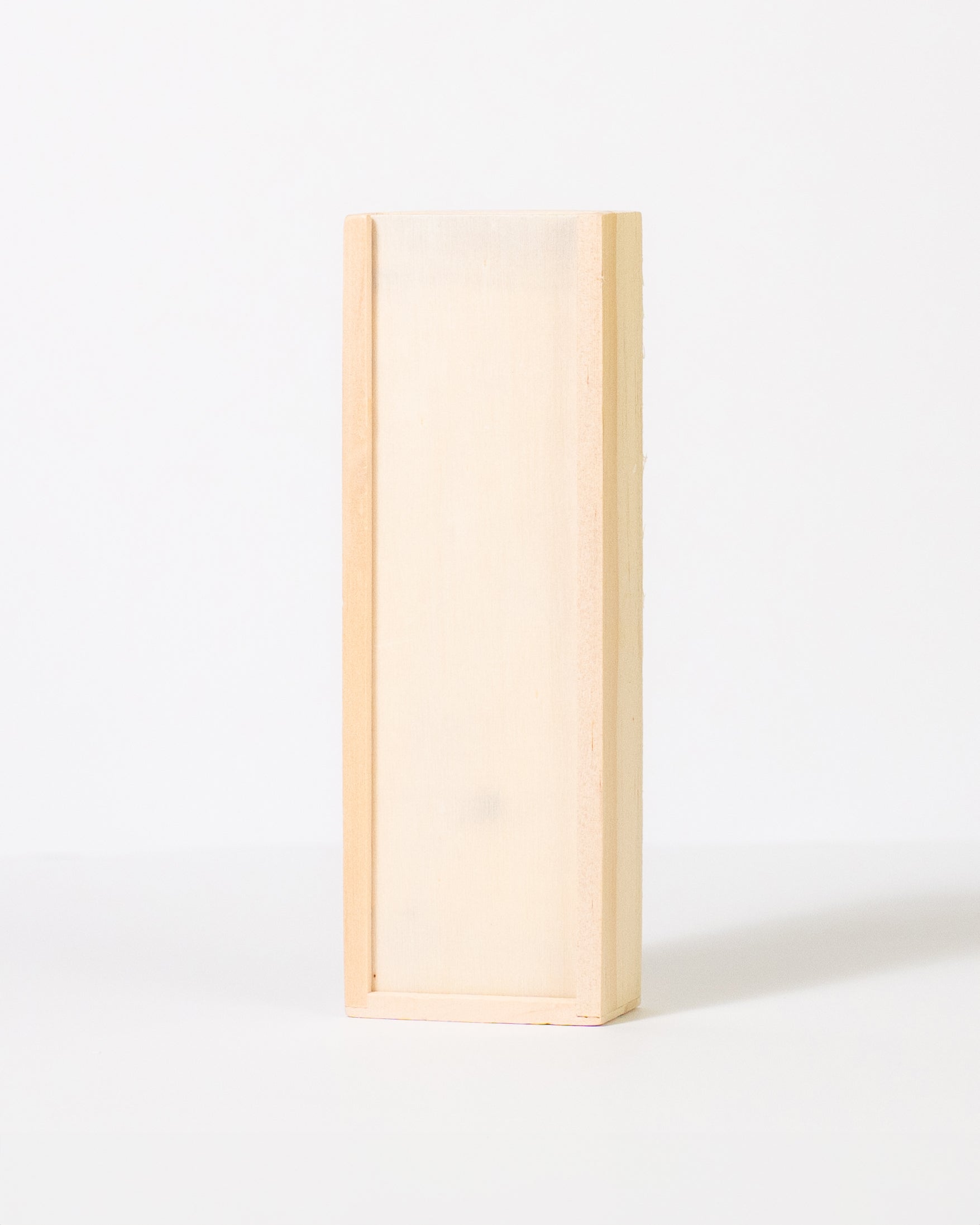 Um brinquedo dominó com caixa e peças feitas em madeira.