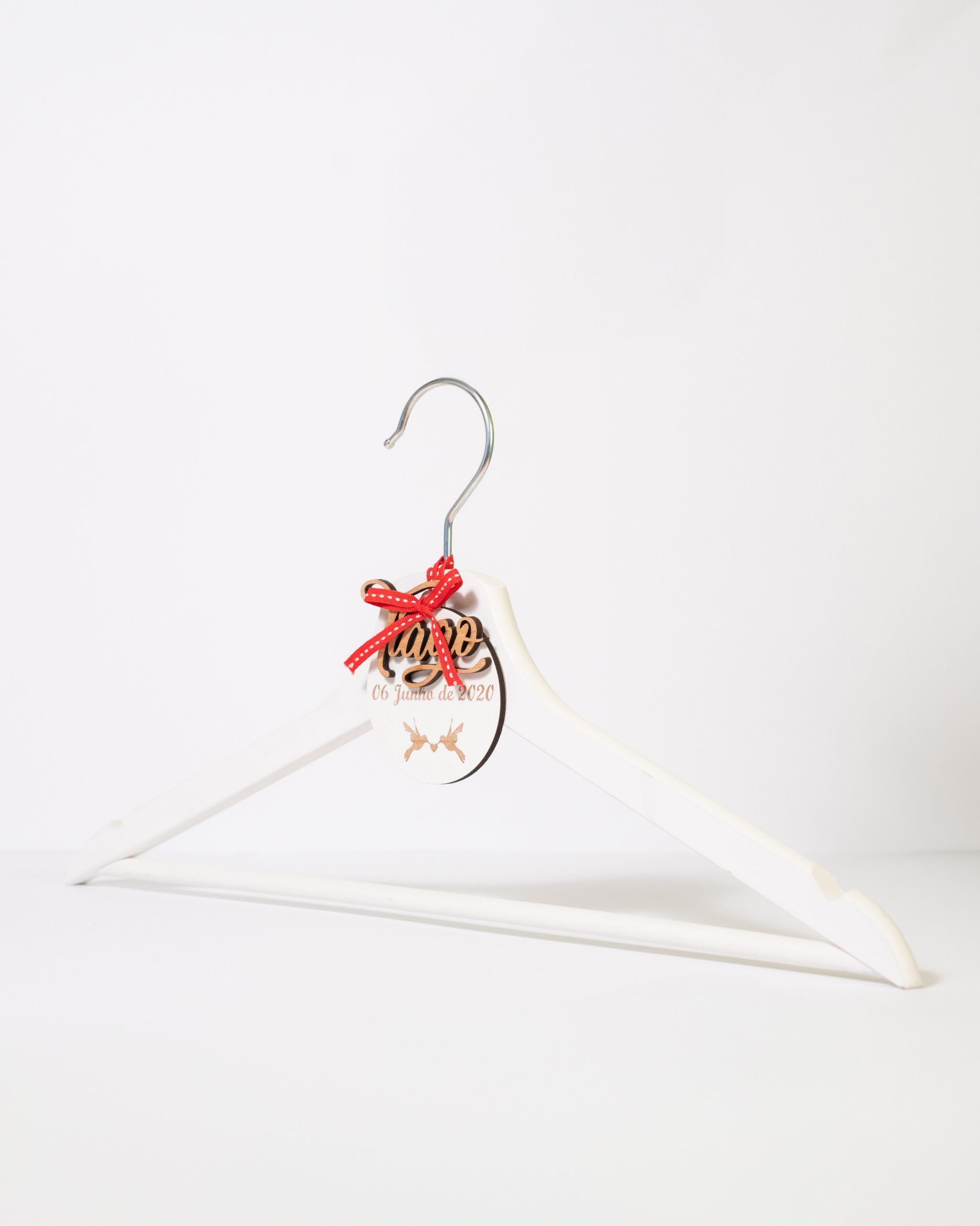 Cabides em madeira com ponta em alumínio. Disponível com opções de personalizar a cor e a gravação