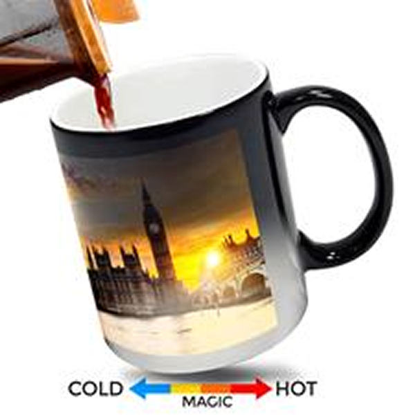 Caneca para sublimação reagente ao calor. A sua gravação apenas fica visível quando a cerâmica aquece. 325ml capacidade. Apta para micro-ondas. Caixa branca de oferta.