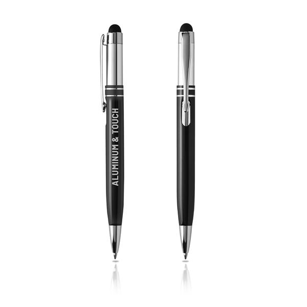 Esferográfica de alumínio e touch. Escrita preta e sistema push