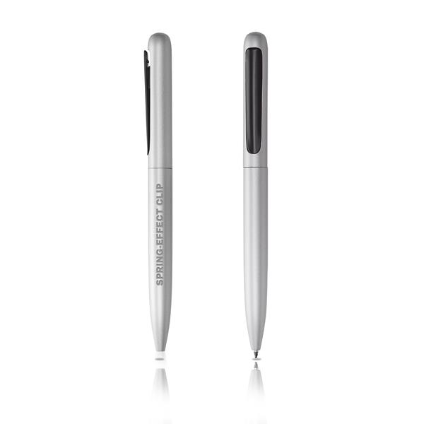 Esferográfica de alumínio. Escrita azul e sistema twist. Com corpo a uma só cor e clip preto, com efeito mola, esta esferográfica é arredondada e sem grande relevo no clip. Personalize e dê um ar futurista à sua campanha.