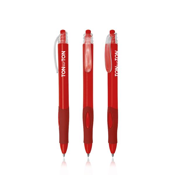Escrita preta, sistema pulsar. Esferográfica com pega e corpo coloridos e clip transparente. Corpo fino. Divulgue a sua marca com este brinde.