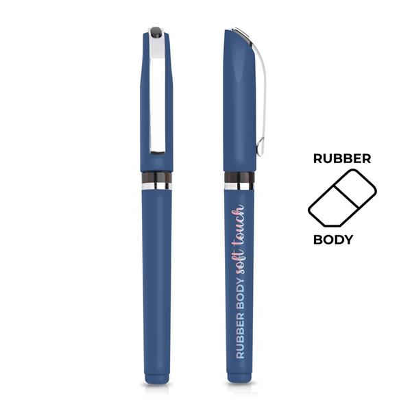 Roller em plástico com acabamento em borracha. Esferográfica de modelo clássico e sempre seguro para associar à personalização que quiser distribuir. O toque de borracha no plástico atribuí-lhe uma ergonomia distinta, de uso agradável com sistema tampa. Esta esferográfica é de escrita preta.