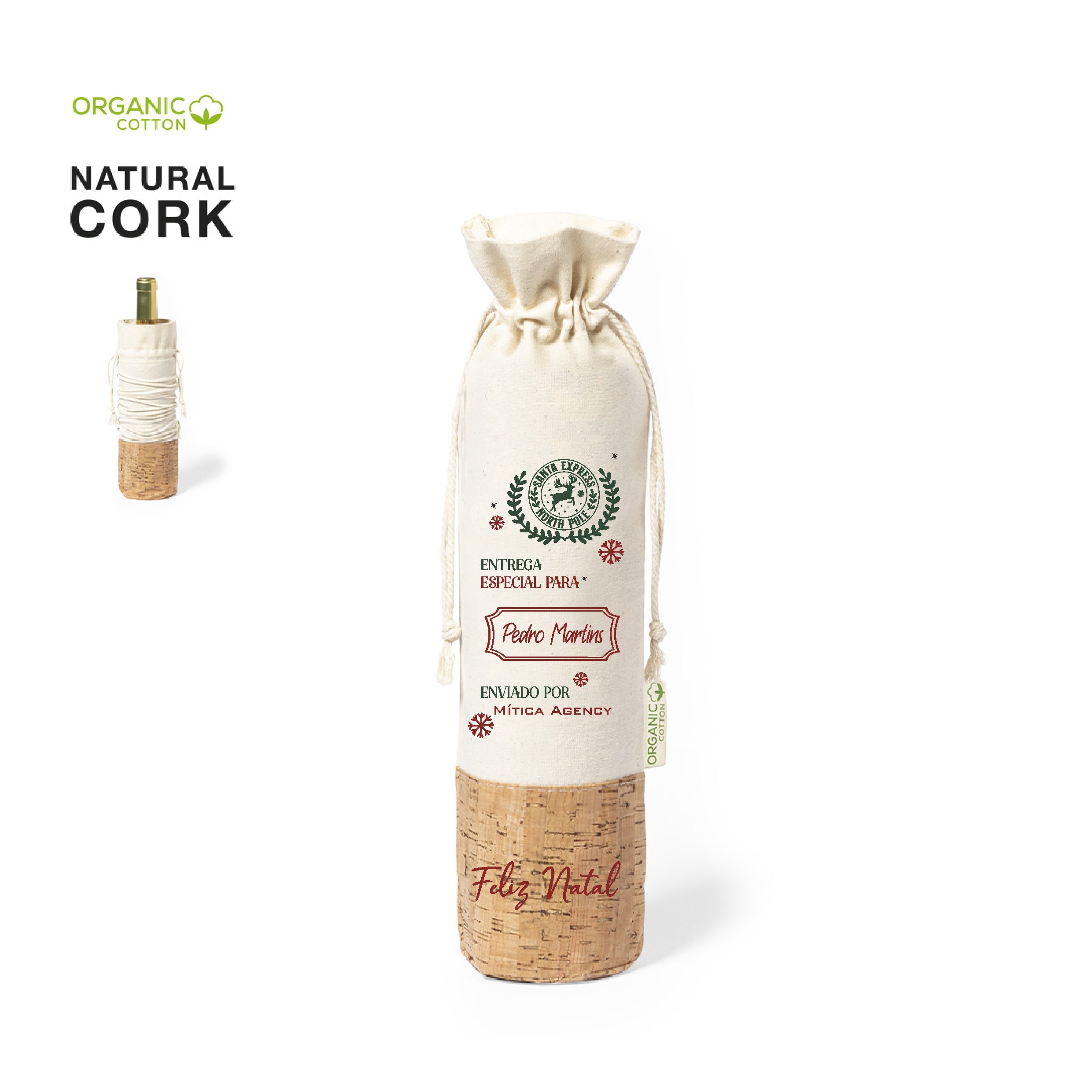 Fabricado em algodão orgânico, com fecho de cordão e base em cortiça natural.